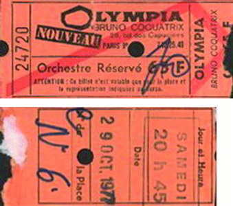 | 29.10.1977 | Paris | Olympia | F | Ticket | O | |||