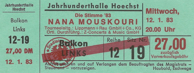 | 12.01.1983 | Frankfurt | Jahrhunderthalle | D | Ticket | C | |||