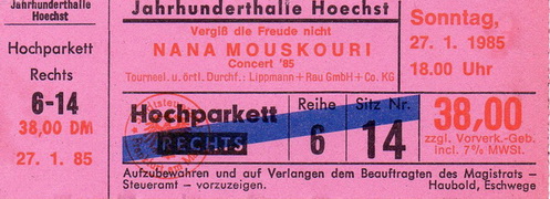 | 26.01.1985 | Frankfurt / Main | Jahrhunderthalle | D | Ticket | C | |||