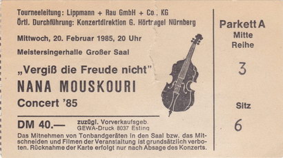 | 21.01.1985 | Mannheim | Rosengarten - Mozartsaal | D | Ticket | C | |||