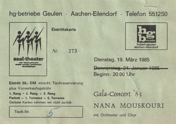 | 19.03.1985 | Aachen | Saaltheater Geulen | D | Ticket | C | |||