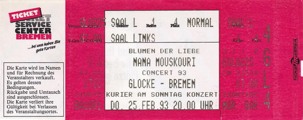 | 25.02.1993 | Bremen | Die Glocke | D | Ticket | O | |||