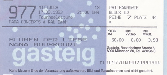 | 17.03.1993 | München | Philharmonie | D | Ticket | O | |||