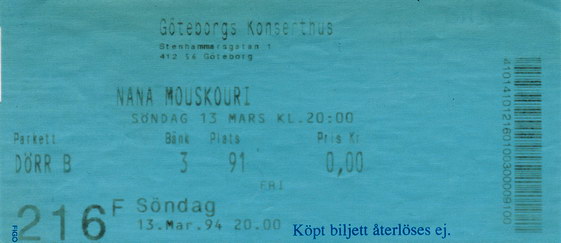| 11.03.1994 | Stockholm | Konserthuset | S | Ticket | O | |||