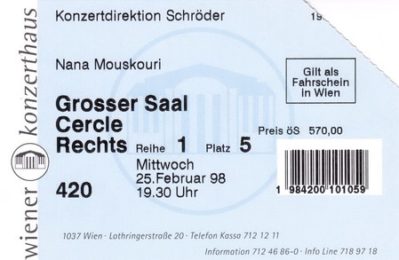 | 25.02.1998 | Wien | Konzerthaus | A | Ticket | O | |||