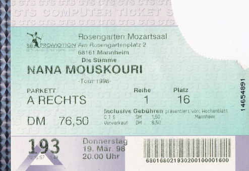 | 19.03.1998 | Mannheim | Mozartsaal | D | Ticket | O | |||