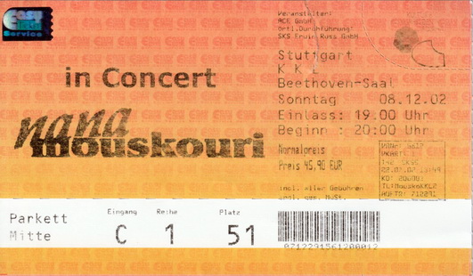| 08.12.2002 | Stuttgart | Liederhalle Beethoven-Saal | D | Ticket | O | |||