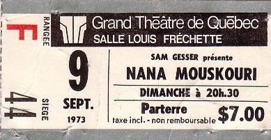 | 09.09.1973 | Québec, QC | Grand Théâtre de Québec - Salle Louis-Fréchette | CDN | Ticket | C | |||