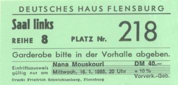 | 16.01.1985 | Flensburg | Deutsches Haus | D | Ticket | C | |||