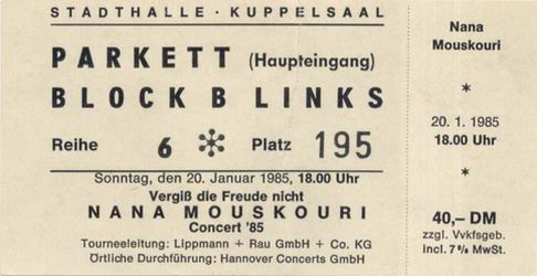 | 20.01.1985 | Hannover | Stadthalle - Kuppelsaal | D | Ticket | C | |||