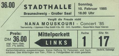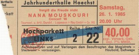 | 26.01.1985 | Frankfurt / Main | Jahrhunderthalle | D | Ticket | C | |||