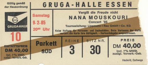 | 09.02.1985 | Essen | Grugahalle | D | Ticket | C | |||