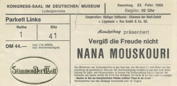 | 21.01.1985 | Mannheim | Rosengarten - Mozartsaal | D | Ticket | C | |||