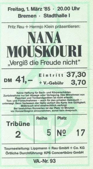 | 01.03.1985 | Bremen | Stadthalle | D | Ticket | C | |||