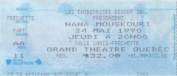 | 23.05.1990 | Québec, QC | Grand Théâtre de Québec - Salle Louis-Fréchette | CDN | Ticket | C | |||