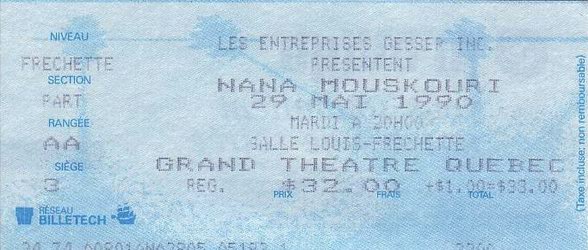 | 29.05.1990 | Québec, QC | Grand Théâtre de Québec - Salle Louis-Fréchette | CDN | Ticket | C | |||