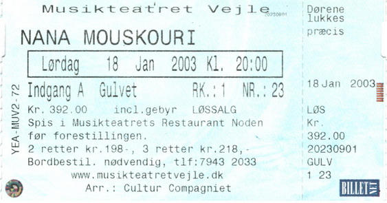 | 18.01.2003 | Vejle | Musikteatret | DK | Ticket | O | |||