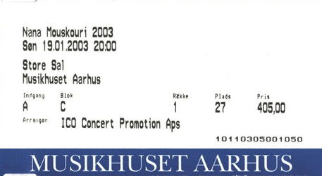 | 19.01.2003 | Arhus | Musikhuset | DK | Ticket | O | |||