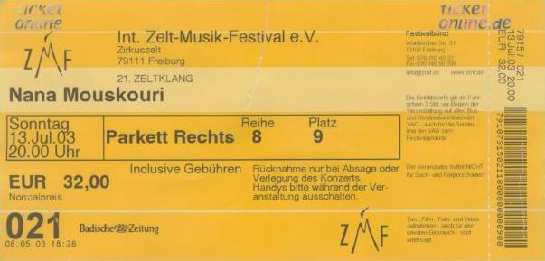 | 13.07.2003 | Freiburg / Breisgau | Zelt Musik Festival - Am Mundenhof (Jazzkonzert) | D | Ticket | O | |||